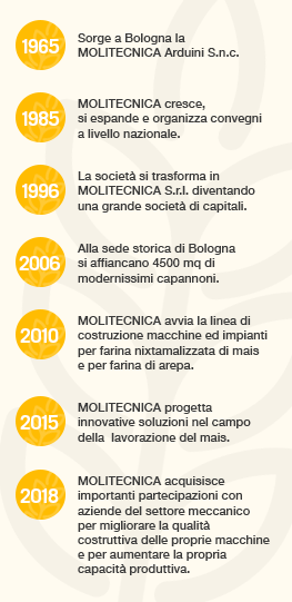 Nell’ambito del programma di espansione, la Molitecnica Arduini nel 1996 si trasforma in MOLITECNICA S.r.l. diventando una grande società di capitali. Sempre nello stesso anno Molitecnica acquista uno stabilimento a Imola dove si decide di sviluppare un magazzino di accessori, tubazioni di caduta, velature, reti… e tutto quanto necessario alla manutenzione ordinaria e straordinaria degli Impianti Molitori. A Imola viene inoltre inaugurata una nuova sezione di rigatura di cilindri da laminatoio; grazie all’inserimento di macchinari altamente tecnologici effettuiamo rigature conto terzi per tutti i più grossi gruppi molitori italiani.