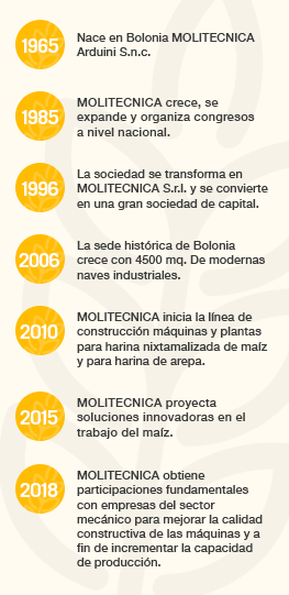 Durante su programa de expansión, Molitecnica Arduini se transforma en 1996 en MOLITECNICA S.r.l. y se convierte en una gran sociedad de capital. Dicho año, Molitecnica adquiere una planta de producción en Imola donde desarrolla un almacén de accesorios, tubos de caída, velos, redes y otros artículos necesarios para el mantenimiento ordinario y extraordinario de las instalaciones de molienda. Siempre en Imola, se inaugura una nueva sección de estriado de cilindros de laminador; gracias a la introducción de maquinarias altamente tecnológicas efectuamos estriado por cuenta de terceros para los grupos de moltura más importantes de Italia.
